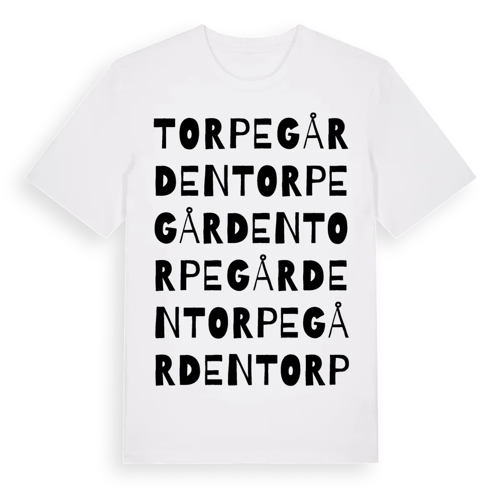 Torpegården ordlek t-shirt är inspirerad av byn Torpegården i Västra Götalands län, Sverige. Tröjan är designad för dig som har en speciell koppling till platsen – oavsett om du bor här, har rötterna här eller bara älskar Torpegården.