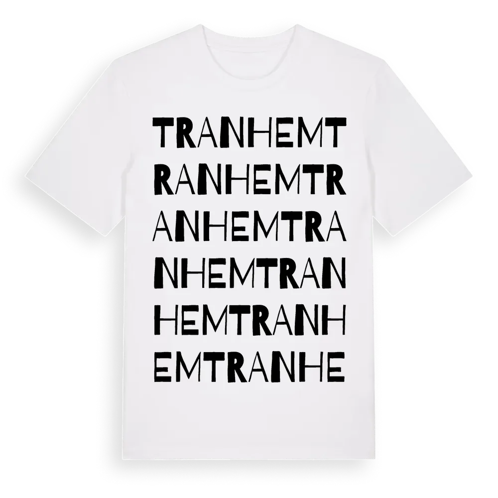 Tranhem ordlek t-shirt är inspirerad av Tranhem i Västra Götalands län, Sverige. Tröjan är designad för dig som har en speciell koppling till platsen – oavsett om du bor här, har rötterna här eller bara älskar Tranhem.