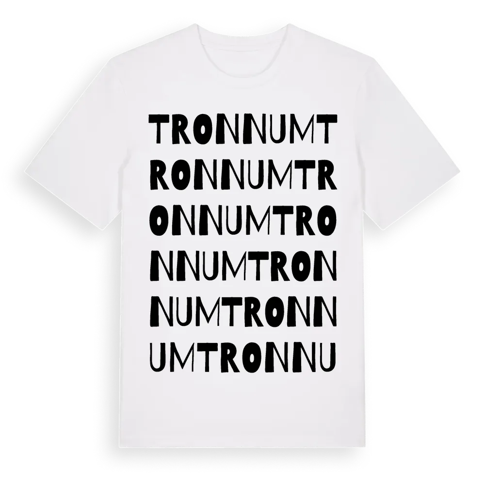 Tronnum ordlek t-shirt är inspirerad av byn Tronnum i Västra Götalands län, Sverige. Tröjan är designad för dig som har en speciell koppling till platsen – oavsett om du bor här, har rötterna här eller bara älskar Tronnum.