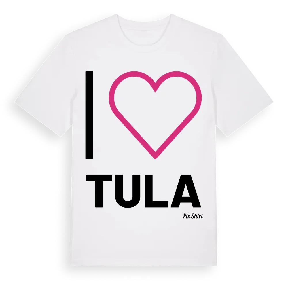 Det klassiska "I ❤ Tula"-motivet i stort format som täcker hela bröstet. För dig som vill visa kärleken till Tula på riktigt. Premium bomull, unisex – från Tula i Västra Götalands län.