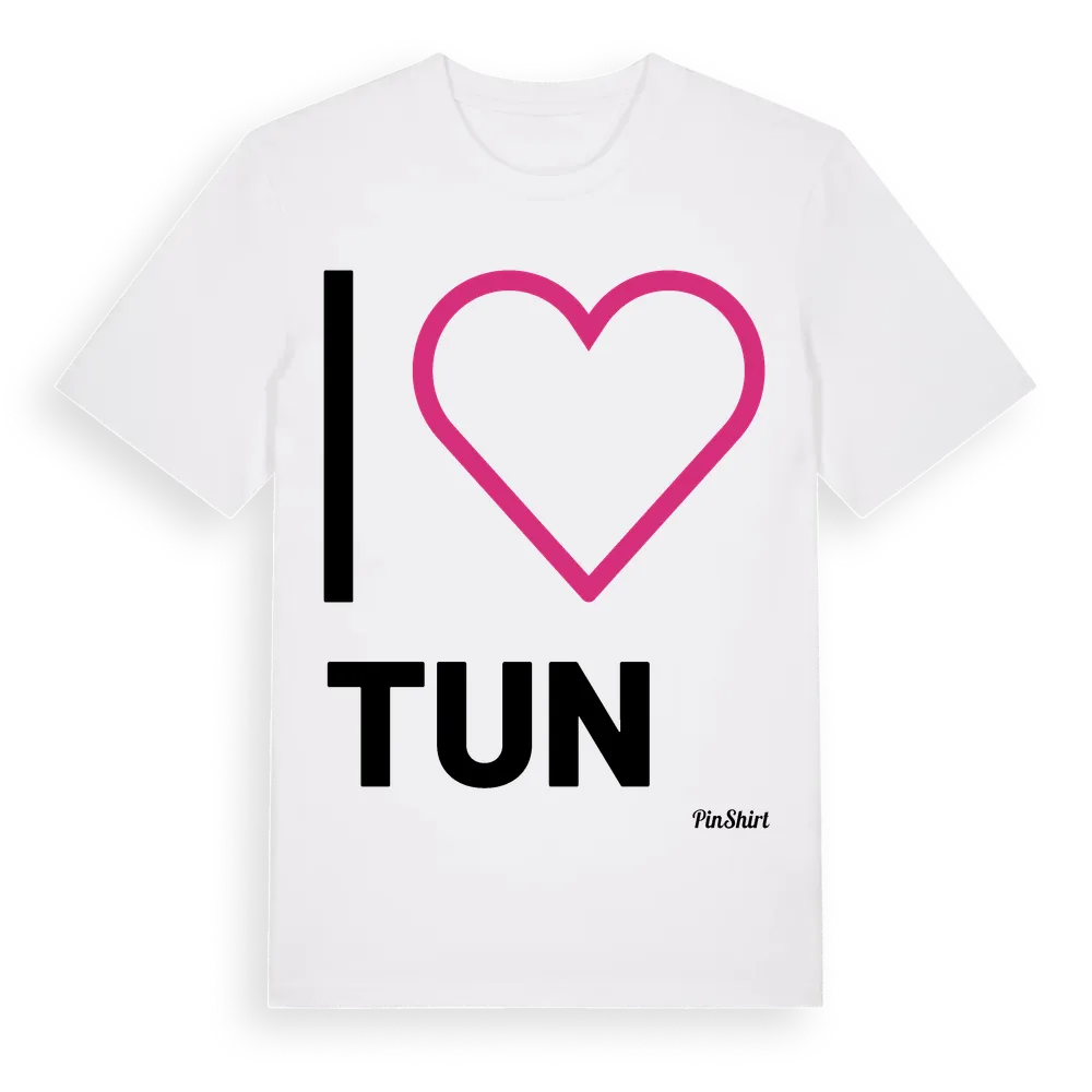 Jag älskar Tun t-shirt stort tryck är inspirerad av byn Tun i Västra Götalands län, Sverige. Tröjan är designad för dig som har en speciell koppling till platsen – oavsett om du bor här, har rötterna här eller bara älskar Tun.