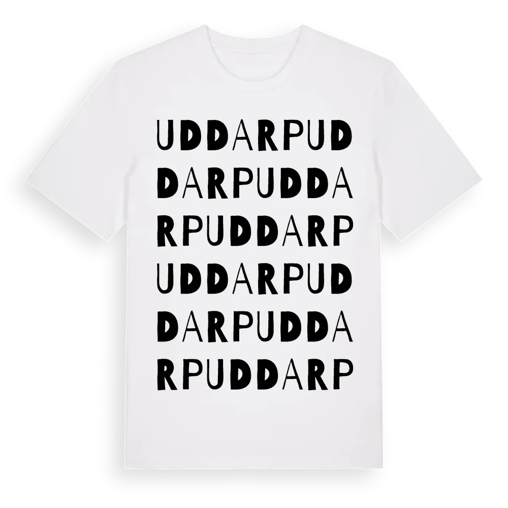 Uddarp ordlek t-shirt är inspirerad av byn Uddarp i Västra Götalands län, Sverige. Tröjan är designad för dig som har en speciell koppling till platsen – oavsett om du bor här, har rötterna här eller bara älskar Uddarp.