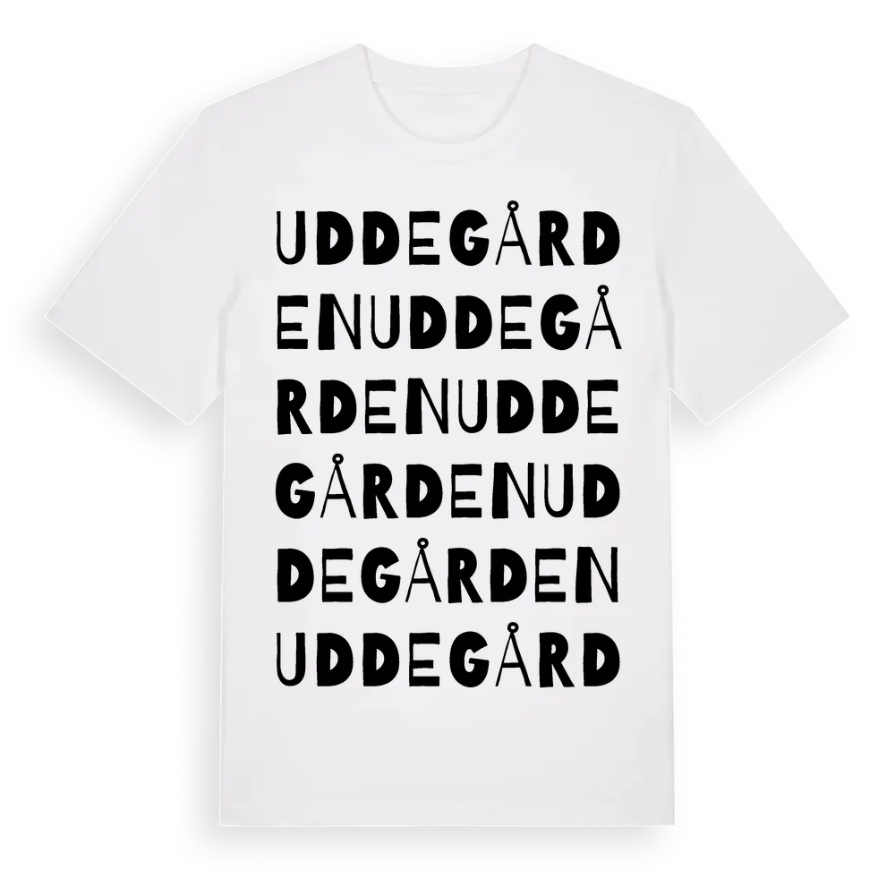 Uddegården ordlek t-shirt är inspirerad av Uddegården i Västra Götalands län, Sverige. Tröjan är designad för dig som har en speciell koppling till platsen – oavsett om du bor här, har rötterna här eller bara älskar Uddegården.