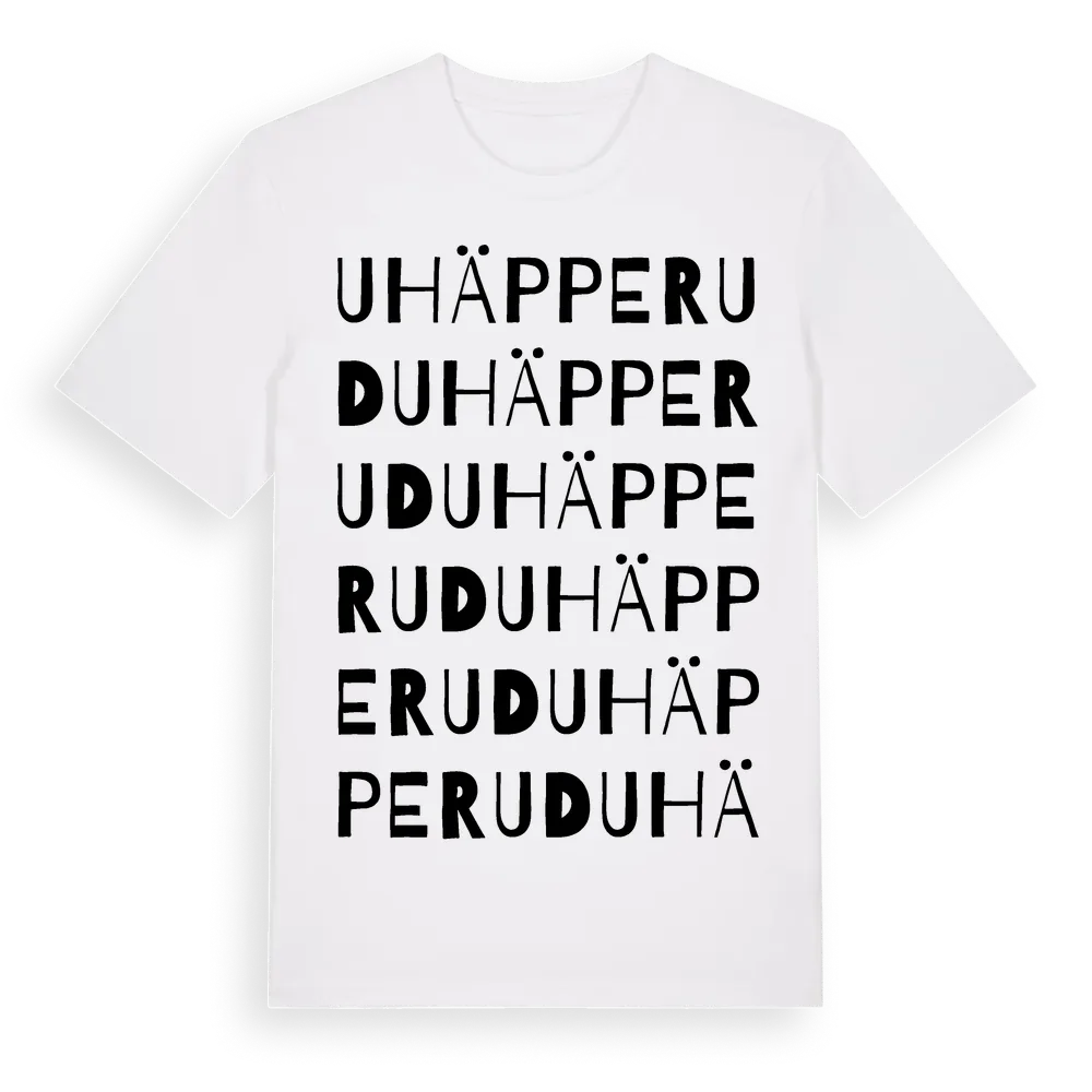 Uhäpperud ordlek t-shirt är inspirerad av Uhäpperud i Västra Götalands län, Sverige. Tröjan är designad för dig som har en speciell koppling till platsen – oavsett om du bor här, har rötterna här eller bara älskar Uhäpperud.