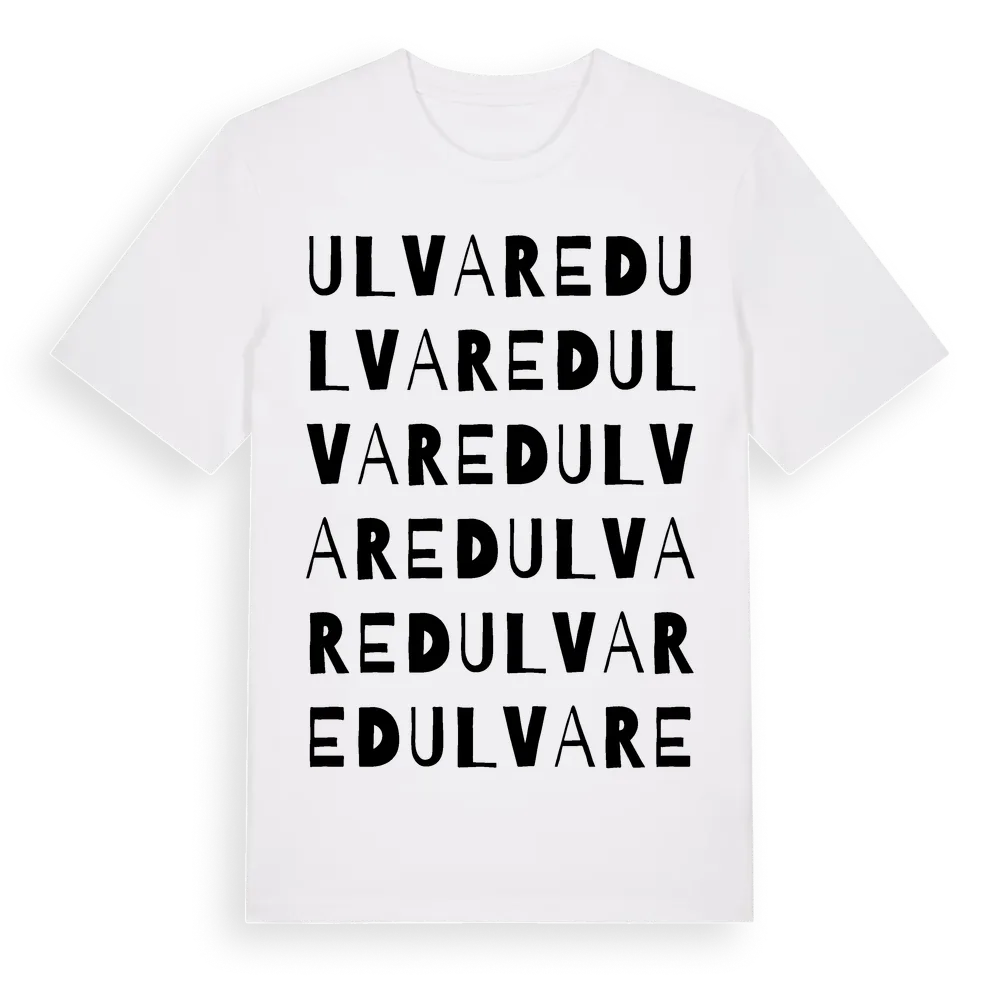 Ulvared ordlek t-shirt är inspirerad av Ulvared i Västra Götalands län, Sverige. Tröjan är designad för dig som har en speciell koppling till platsen – oavsett om du bor här, har rötterna här eller bara älskar Ulvared.
