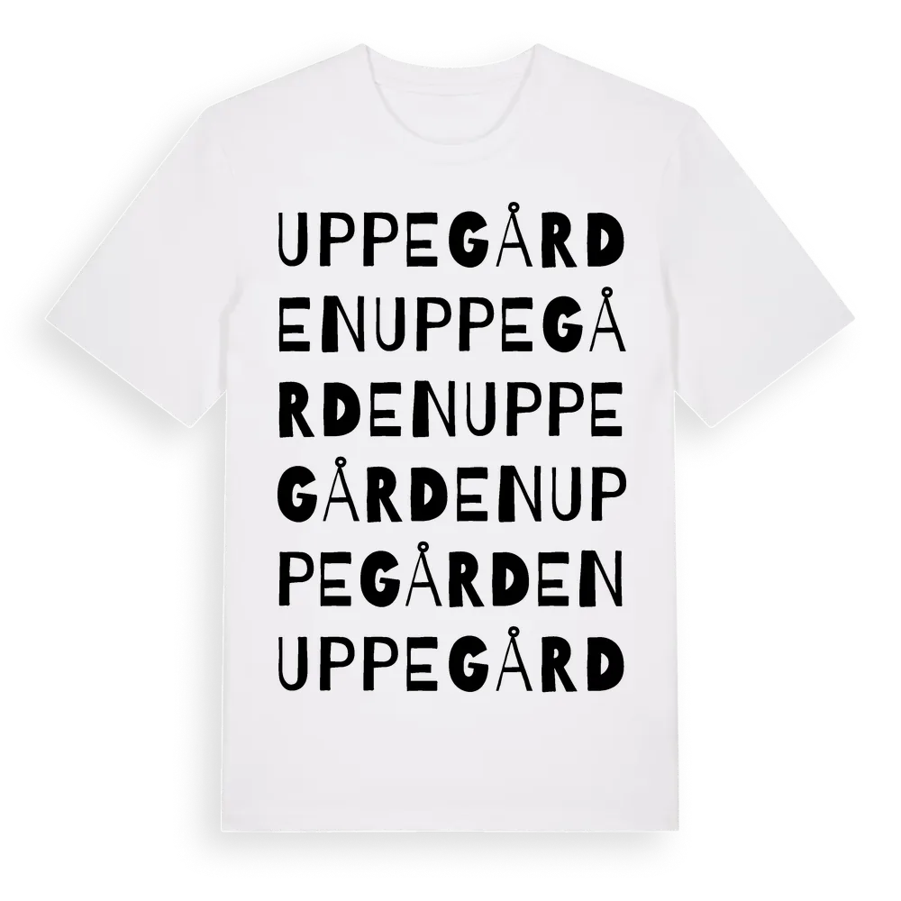 Uppegården ordlek t-shirt är inspirerad av Uppegården i Västra Götalands län, Sverige. Tröjan är designad för dig som har en speciell koppling till platsen – oavsett om du bor här, har rötterna här eller bara älskar Uppegården.
