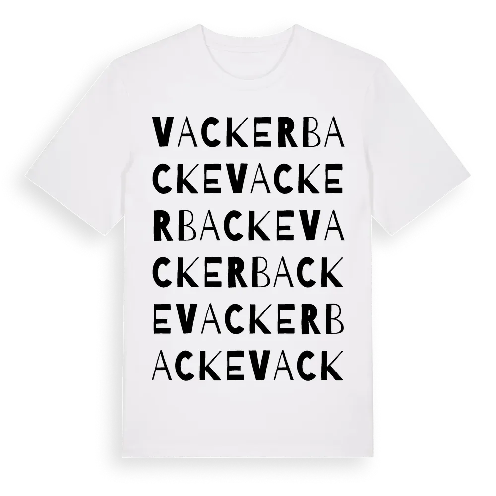 Vackerbacke ordlek t-shirt är inspirerad av Vackerbacke i Västra Götalands län, Sverige. Tröjan är designad för dig som har en speciell koppling till platsen – oavsett om du bor här, har rötterna här eller bara älskar Vackerbacke.