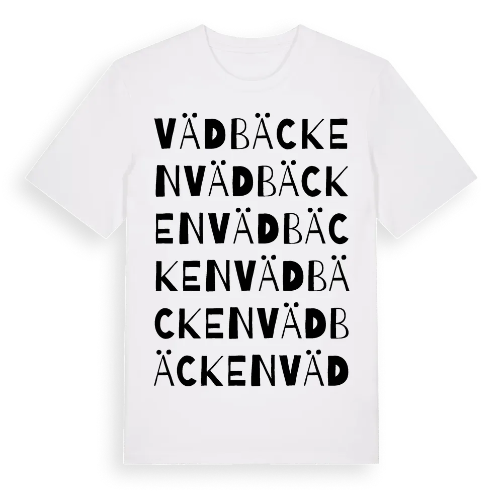 Vädbäcken ordlek t-shirt är inspirerad av byn Vädbäcken i Västra Götalands län, Sverige. Tröjan är designad för dig som har en speciell koppling till platsen – oavsett om du bor här, har rötterna här eller bara älskar Vädbäcken.