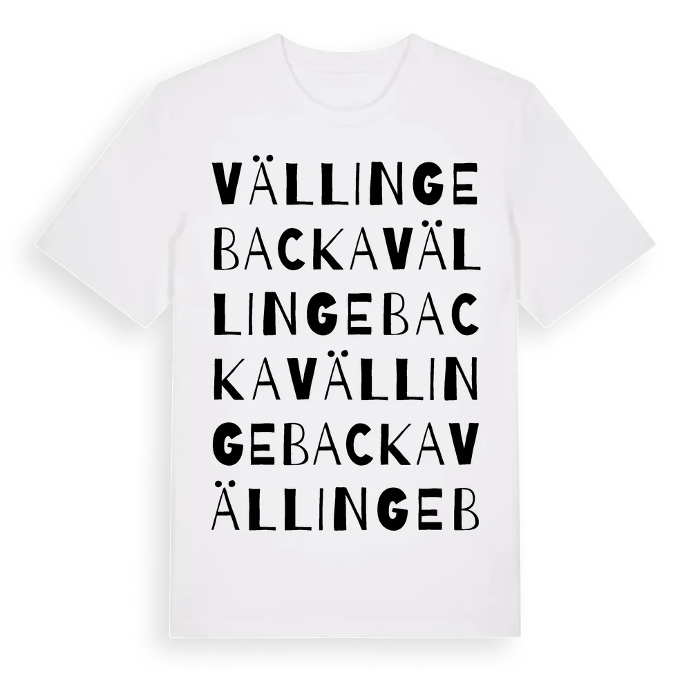 Vällingebacka ordlek t-shirt är inspirerad av byn Vällingebacka i Västra Götalands län, Sverige. Tröjan är designad för dig som har en speciell koppling till platsen – oavsett om du bor här, har rötterna här eller bara älskar Vällingebacka.