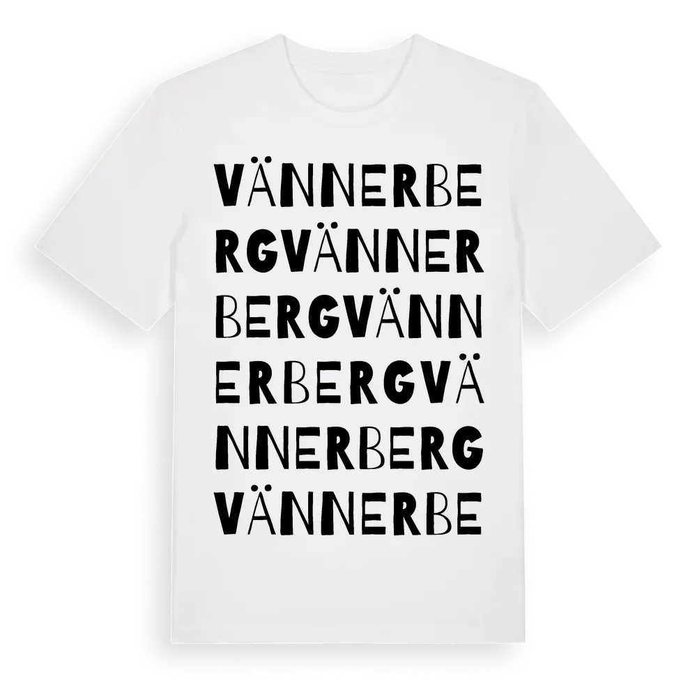 Vännerberg ordlek t-shirt är inspirerad av stadsdelen Vännerberg i Västra Götalands län, Sverige. Tröjan är designad för dig som har en speciell koppling till platsen – oavsett om du bor här, har rötterna här eller bara älskar Vännerberg.