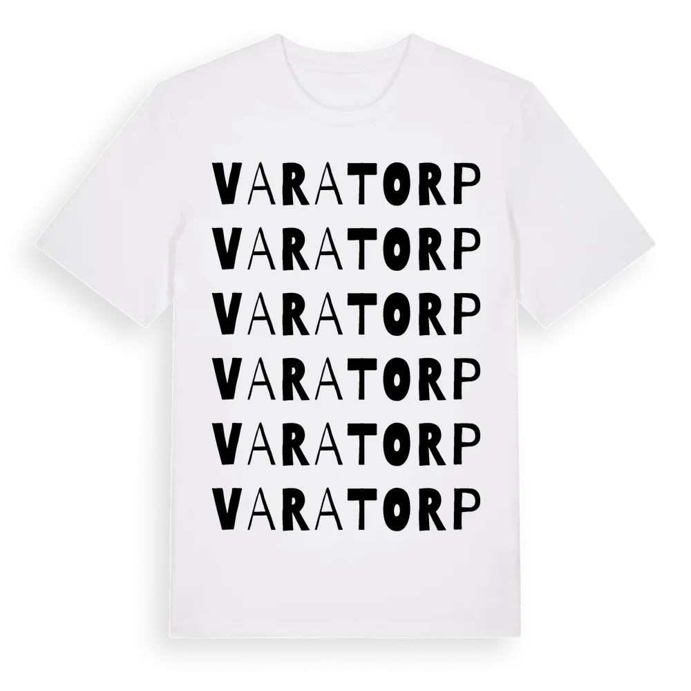 Varatorp ordlek t-shirt är inspirerad av Varatorp i Västra Götalands län, Sverige. Tröjan är designad för dig som har en speciell koppling till platsen – oavsett om du bor här, har rötterna här eller bara älskar Varatorp.