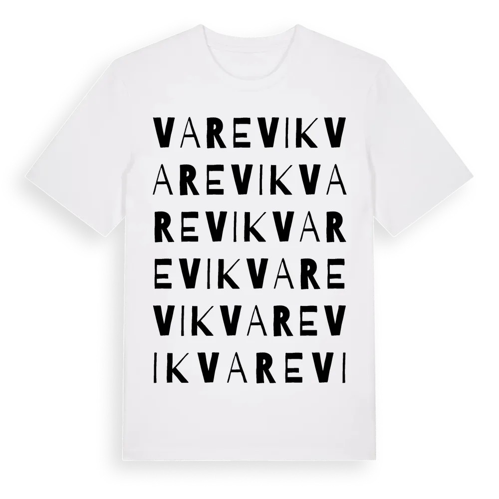 Varevik ordlek t-shirt är inspirerad av byn Varevik i Västra Götalands län, Sverige. Tröjan är designad för dig som har en speciell koppling till platsen – oavsett om du bor här, har rötterna här eller bara älskar Varevik.