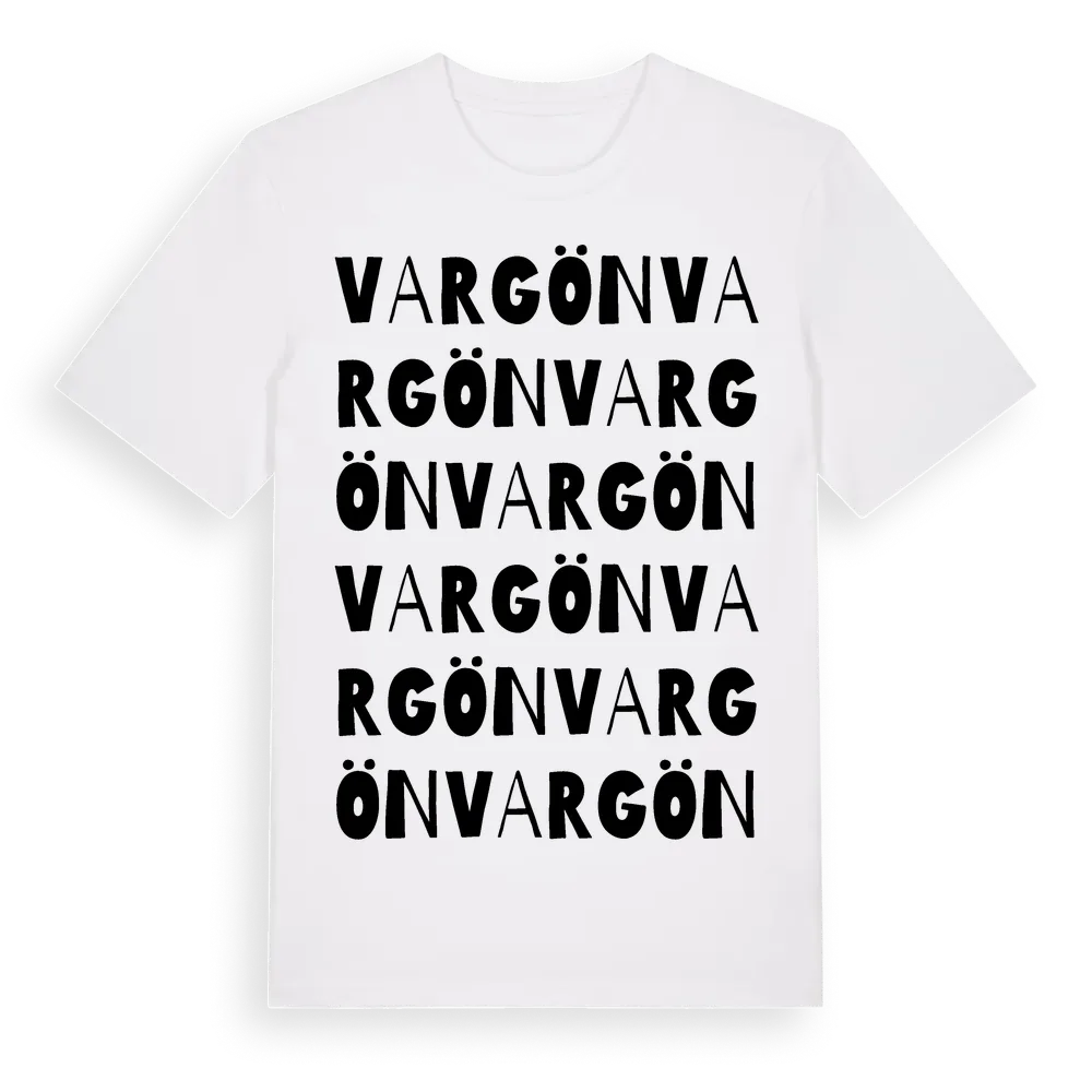En ordlek byggd på Vargöns namn. Subtilt och klurig – ett motiv som bara de som verkligen känner platsen fullt ut förstår. Premium bomull, unisex – från byn Vargön i Västra Götalands län.