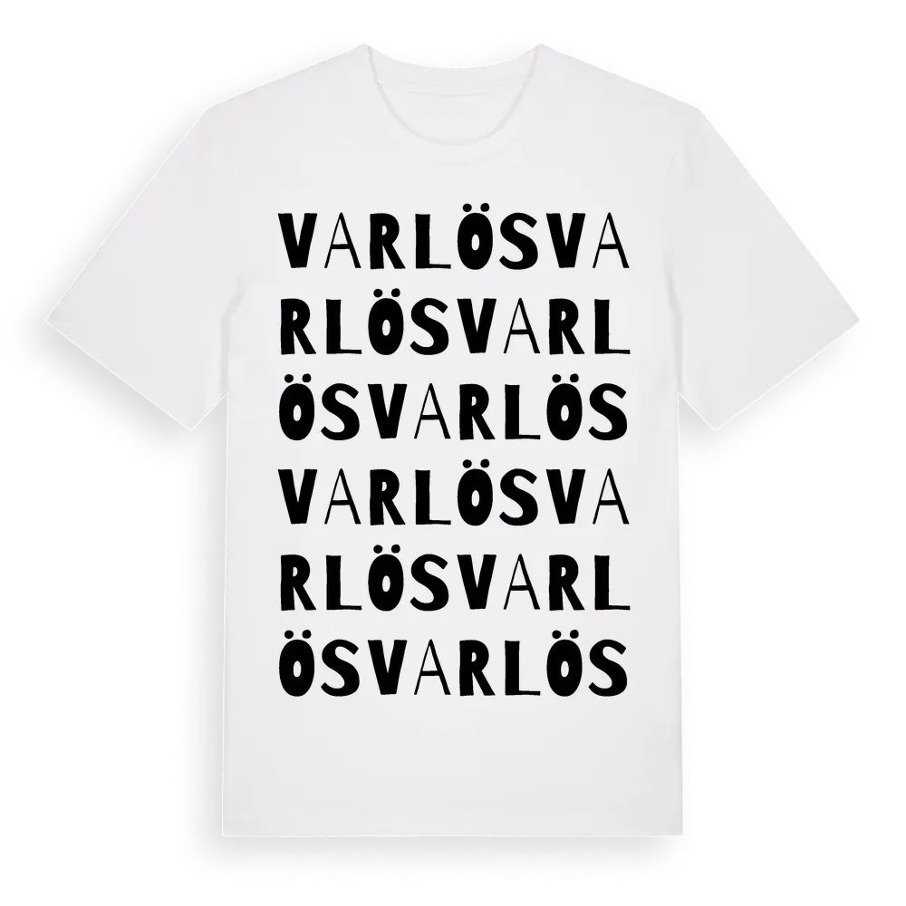 En ordlek byggd på Varlöss namn. Subtilt och klurig – ett motiv som bara de som verkligen känner platsen fullt ut förstår. Premium bomull, unisex – från Varlös i Västra Götalands län.