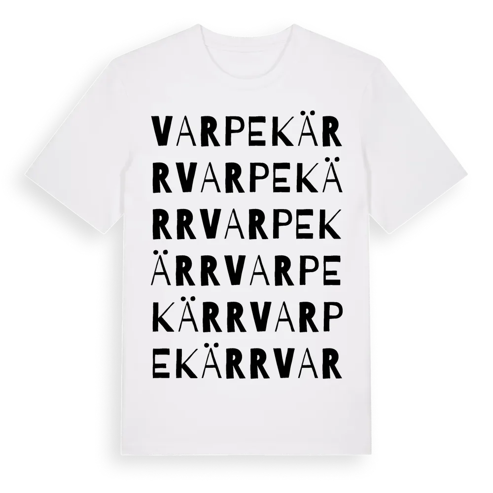 Varpekärr ordlek t-shirt är inspirerad av byn Varpekärr i Västra Götalands län, Sverige. Tröjan är designad för dig som har en speciell koppling till platsen – oavsett om du bor här, har rötterna här eller bara älskar Varpekärr.