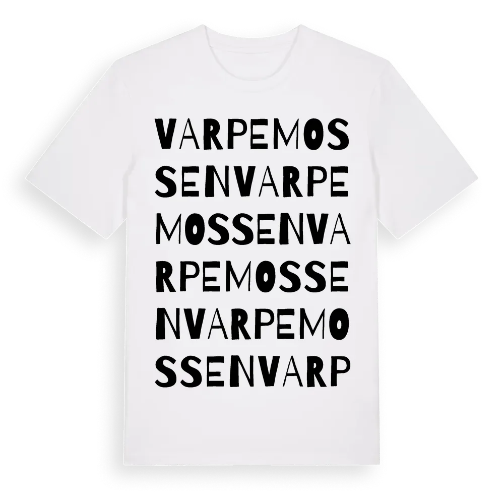 Varpemossen ordlek t-shirt är inspirerad av stadsdelen Varpemossen i Västra Götalands län, Sverige. Tröjan är designad för dig som har en speciell koppling till platsen – oavsett om du bor här, har rötterna här eller bara älskar Varpemossen.