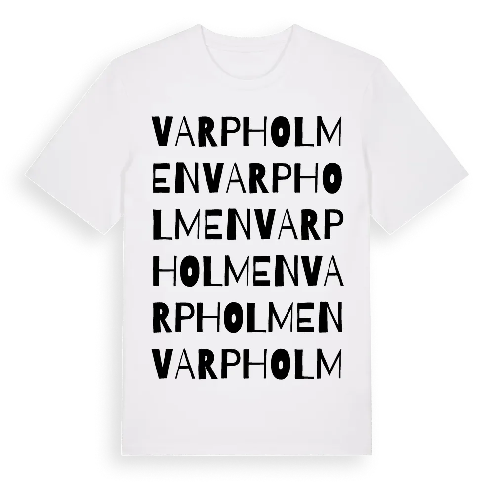 Varpholmen ordlek t-shirt är inspirerad av Varpholmen i Västra Götalands län, Sverige. Tröjan är designad för dig som har en speciell koppling till platsen – oavsett om du bor här, har rötterna här eller bara älskar Varpholmen.