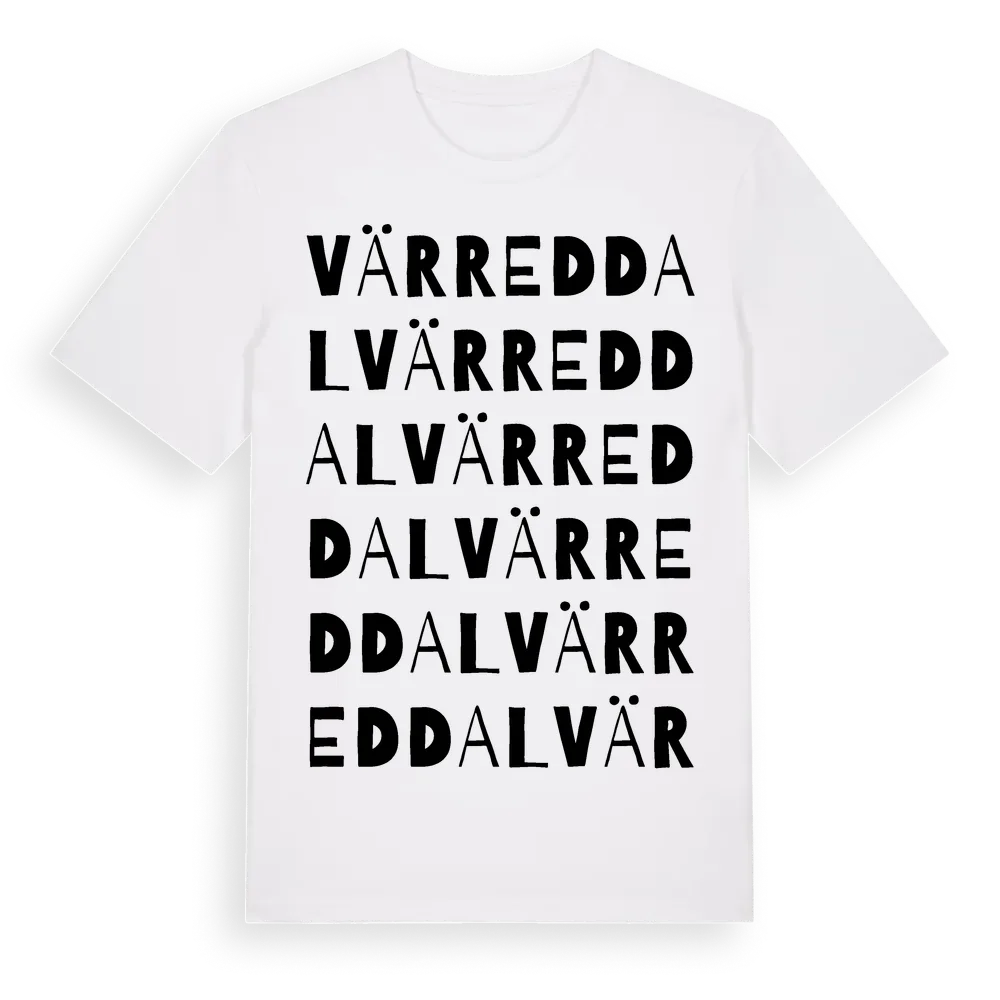 Värreddal ordlek t-shirt är inspirerad av Värreddal i Västra Götalands län, Sverige. Tröjan är designad för dig som har en speciell koppling till platsen – oavsett om du bor här, har rötterna här eller bara älskar Värreddal.