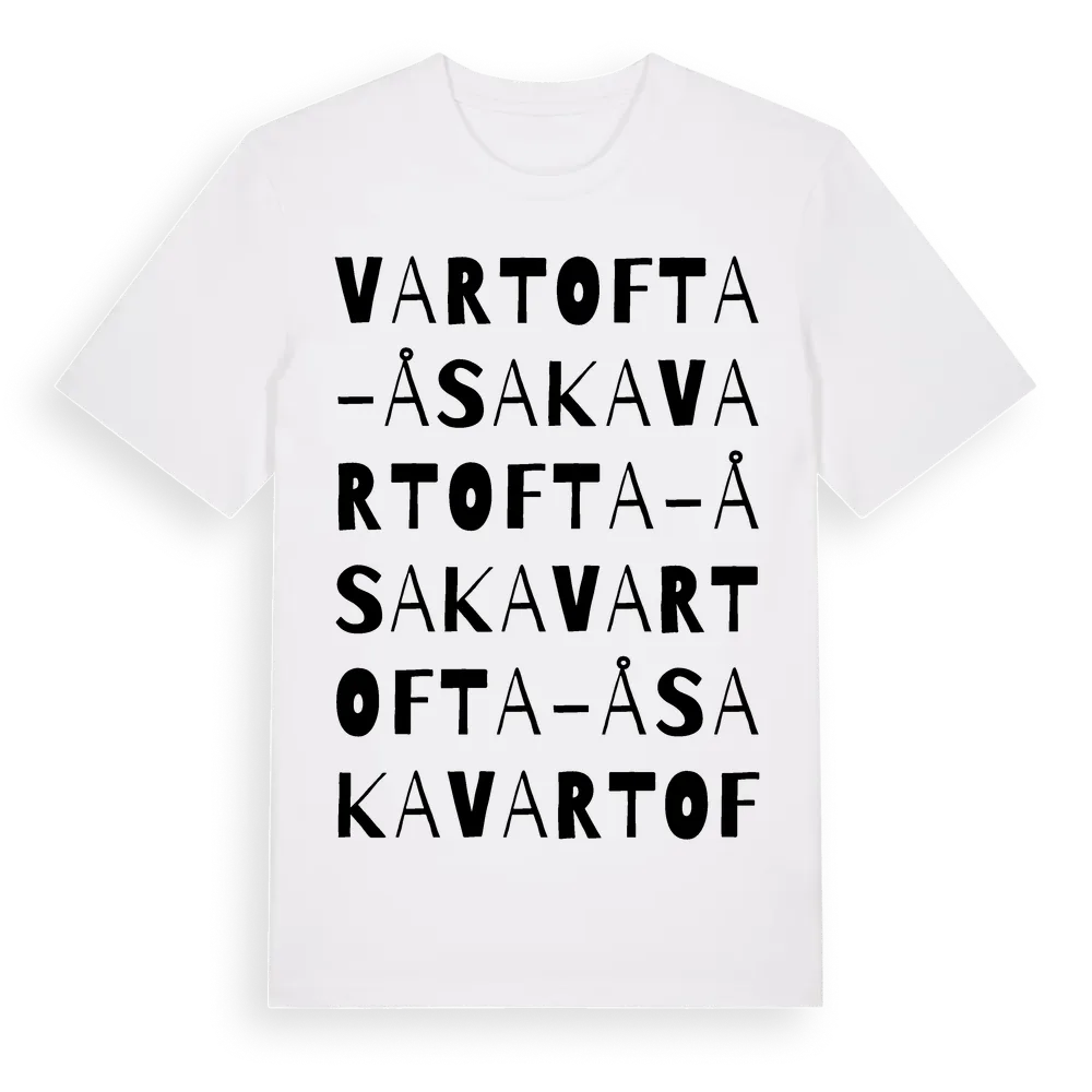 Vartofta-Åsaka ordlek t-shirt är inspirerad av byn Vartofta-Åsaka i Västra Götalands län, Sverige. Tröjan är designad för dig som har en speciell koppling till platsen – oavsett om du bor här, har rötterna här eller bara älskar Vartofta-Åsaka.