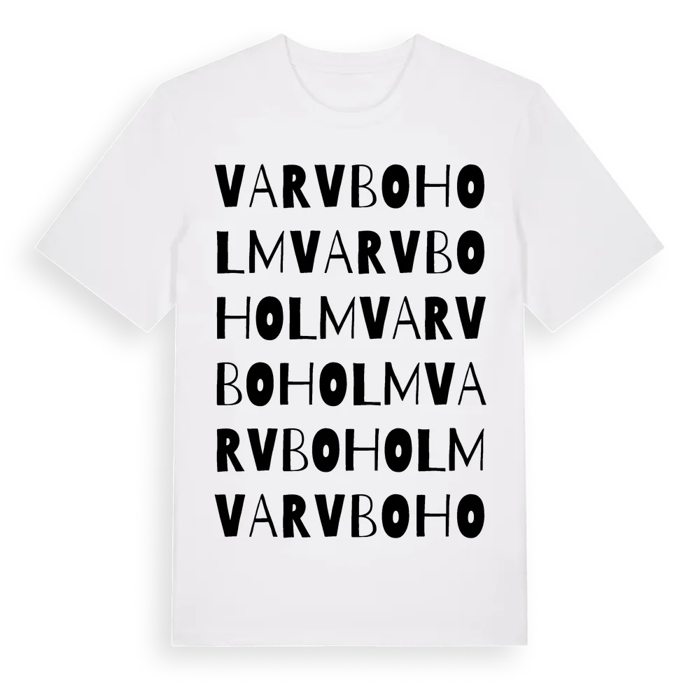 Varvboholm ordlek t-shirt är inspirerad av Varvboholm i Västra Götalands län, Sverige. Tröjan är designad för dig som har en speciell koppling till platsen – oavsett om du bor här, har rötterna här eller bara älskar Varvboholm.