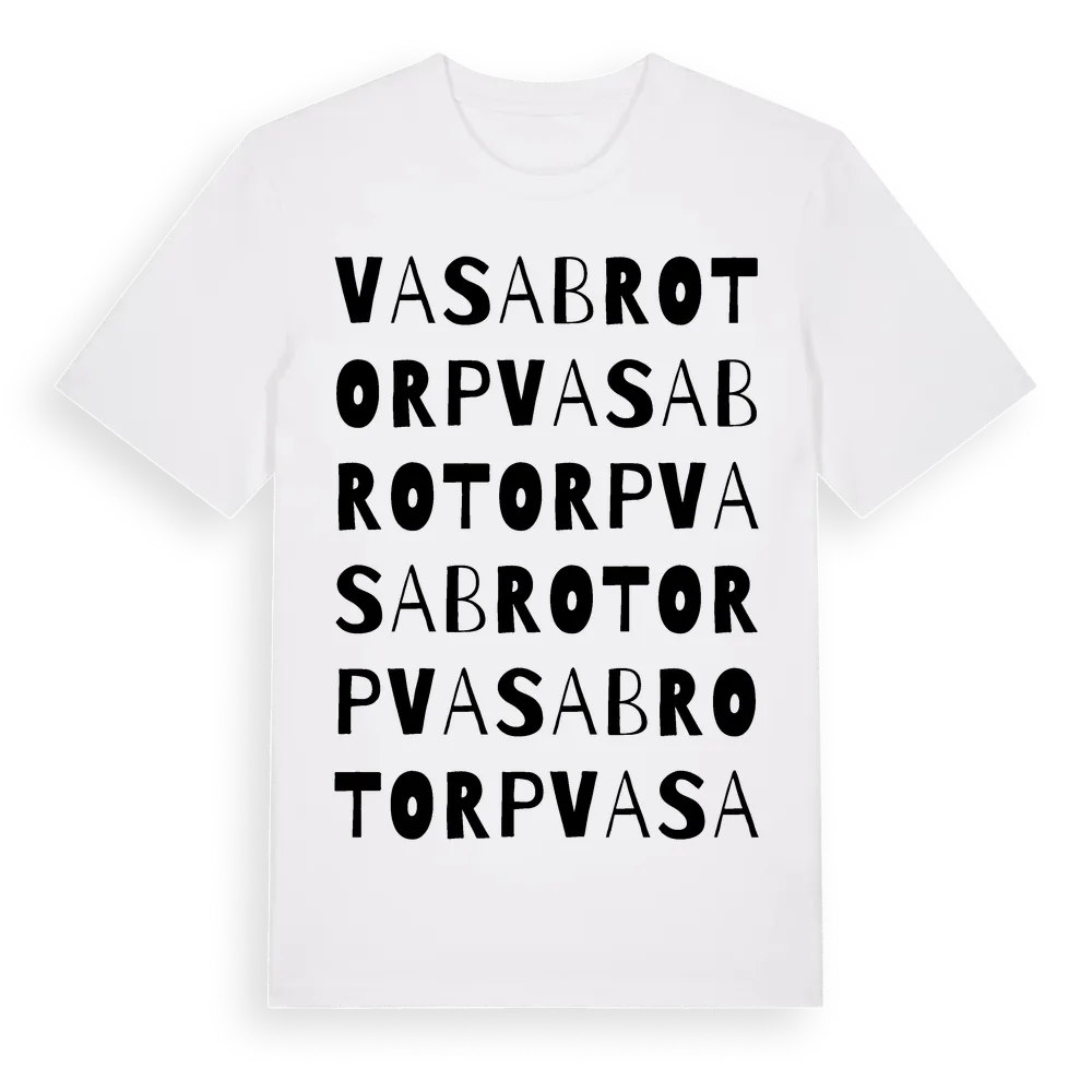 Vasabrotorp ordlek t-shirt är inspirerad av Vasabrotorp i Västra Götalands län, Sverige. Tröjan är designad för dig som har en speciell koppling till platsen – oavsett om du bor här, har rötterna här eller bara älskar Vasabrotorp.