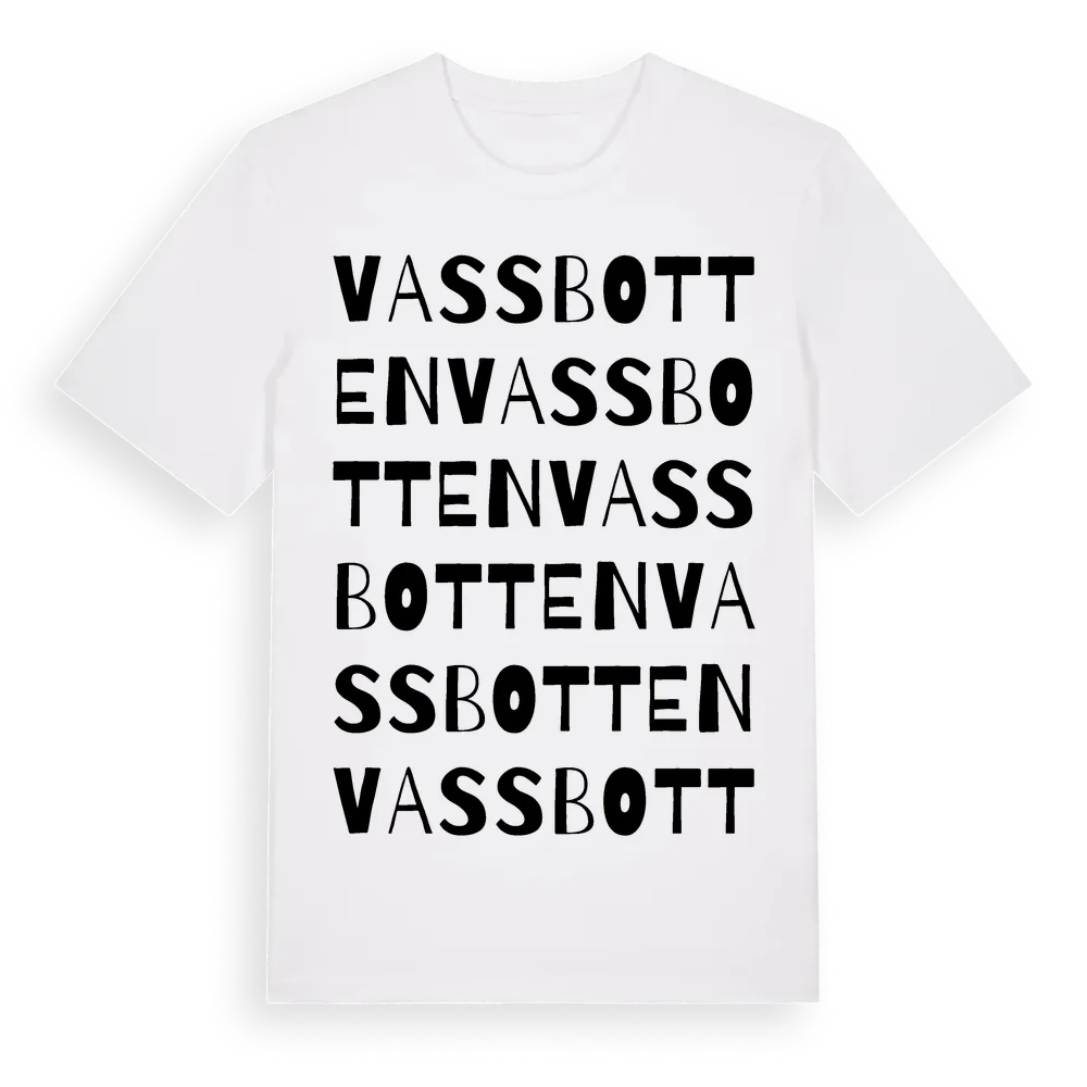 En ordlek byggd på Vassbottens namn. Subtilt och klurig – ett motiv som bara de som verkligen känner platsen fullt ut förstår. Premium bomull, unisex – från Vassbotten i Västra Götalands län.