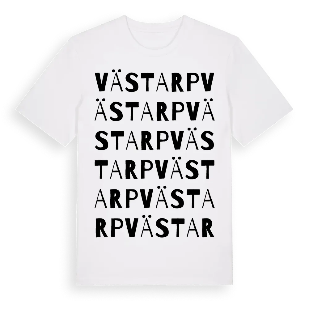 Västarp ordlek t-shirt är inspirerad av Västarp i Västra Götalands län, Sverige. Tröjan är designad för dig som har en speciell koppling till platsen – oavsett om du bor här, har rötterna här eller bara älskar Västarp.