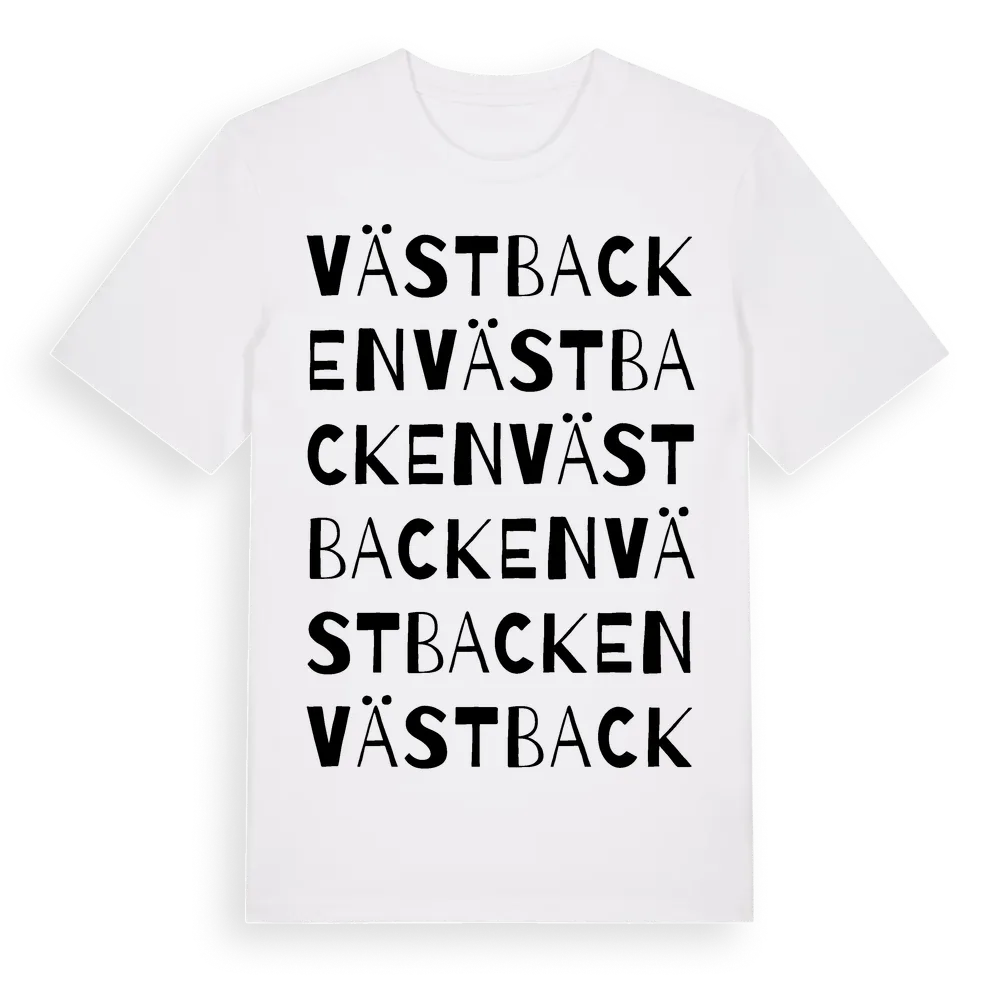 Västbacken ordlek t-shirt är inspirerad av byn Västbacken i Västra Götalands län, Sverige. Tröjan är designad för dig som har en speciell koppling till platsen – oavsett om du bor här, har rötterna här eller bara älskar Västbacken.