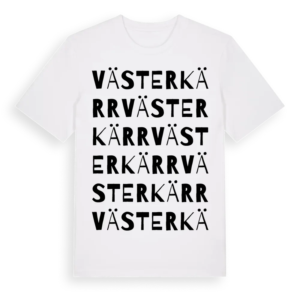 Västerkärr ordlek t-shirt är inspirerad av Västerkärr i Västra Götalands län, Sverige. Tröjan är designad för dig som har en speciell koppling till platsen – oavsett om du bor här, har rötterna här eller bara älskar Västerkärr.