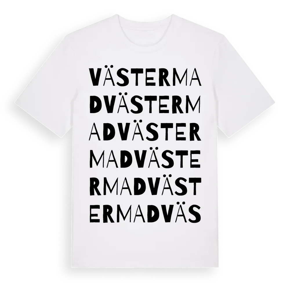 Västermad ordlek t-shirt är inspirerad av Västermad i Västra Götalands län, Sverige. Tröjan är designad för dig som har en speciell koppling till platsen – oavsett om du bor här, har rötterna här eller bara älskar Västermad.