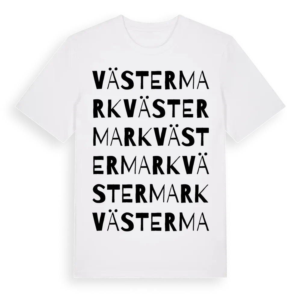 Västermark ordlek t-shirt är inspirerad av Västermark i Västra Götalands län, Sverige. Tröjan är designad för dig som har en speciell koppling till platsen – oavsett om du bor här, har rötterna här eller bara älskar Västermark.