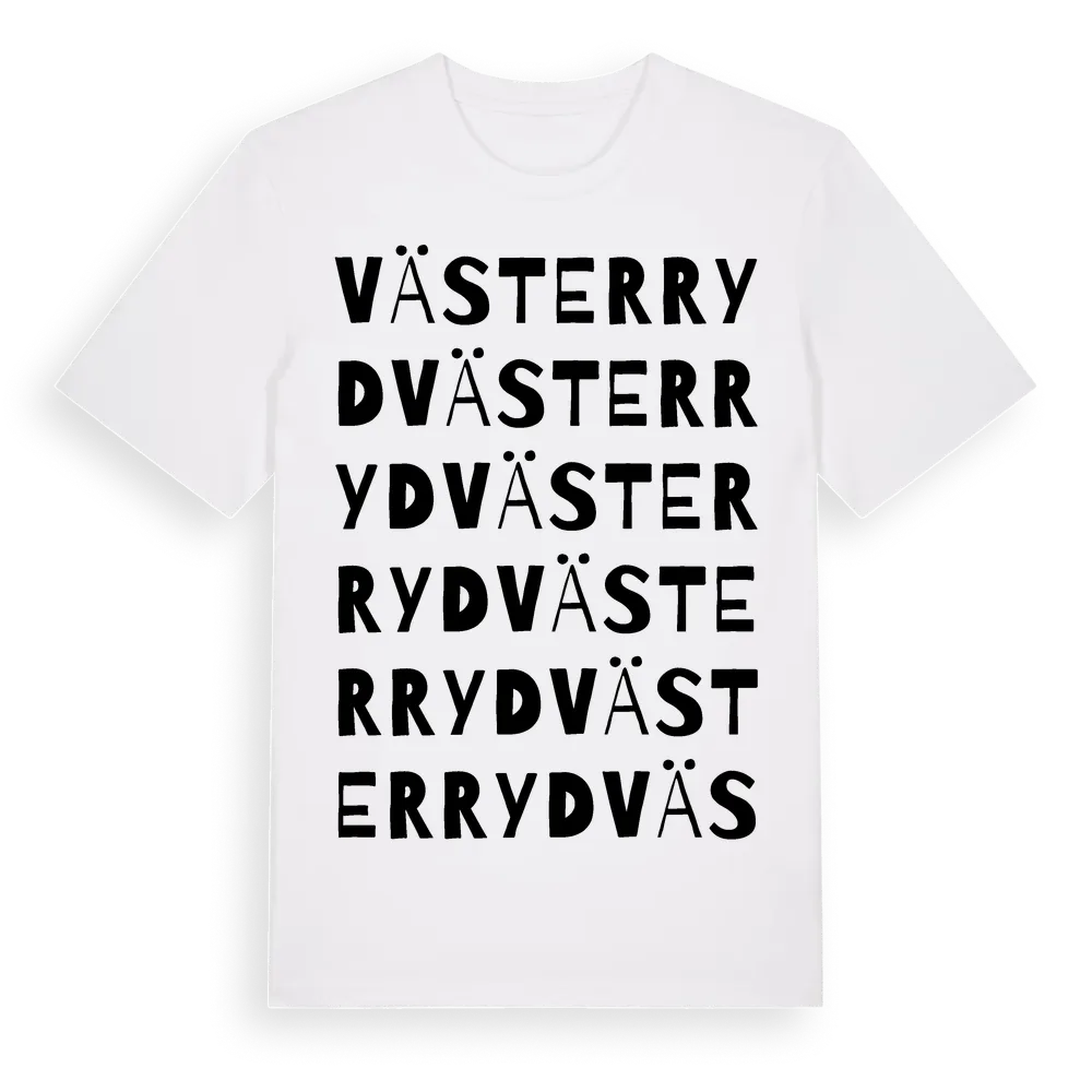 Västerryd ordlek t-shirt är inspirerad av Västerryd i Västra Götalands län, Sverige. Tröjan är designad för dig som har en speciell koppling till platsen – oavsett om du bor här, har rötterna här eller bara älskar Västerryd.