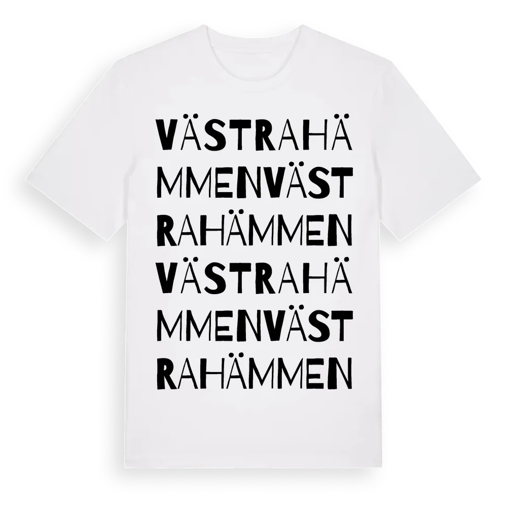 Västra Hämmen ordlek t-shirt är inspirerad av byn Västra Hämmen i Västra Götalands län, Sverige. Tröjan är designad för dig som har en speciell koppling till platsen – oavsett om du bor här, har rötterna här eller bara älskar Västra Hämmen.