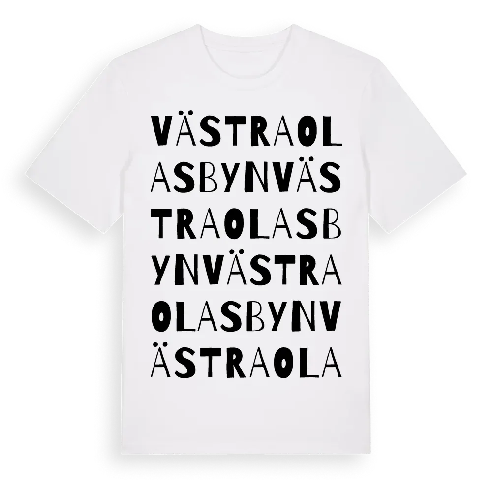 Västra Olasbyn ordlek t-shirt är inspirerad av byn Västra Olasbyn i Västra Götalands län, Sverige. Tröjan är designad för dig som har en speciell koppling till platsen – oavsett om du bor här, har rötterna här eller bara älskar Västra Olasbyn.