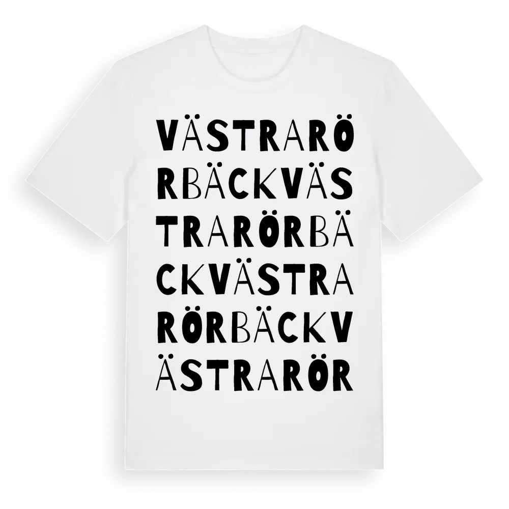 Västra Rörbäck ordlek t-shirt är inspirerad av byn Västra Rörbäck i Västra Götalands län, Sverige. Tröjan är designad för dig som har en speciell koppling till platsen – oavsett om du bor här, har rötterna här eller bara älskar Västra Rörbäck.