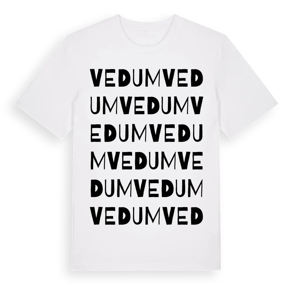 En ordlek byggd på Vedums namn. Subtilt och klurig – ett motiv som bara de som verkligen känner platsen fullt ut förstår. Premium bomull, unisex – från byn Vedum i Västra Götalands län.