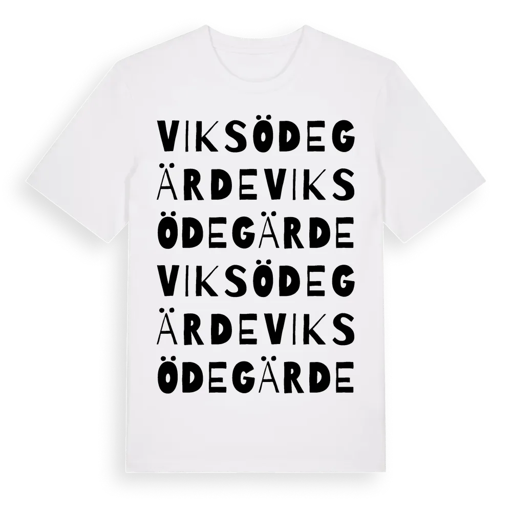 Viks Ödegärde ordlek t-shirt är inspirerad av Viks Ödegärde i Västra Götalands län, Sverige. Tröjan är designad för dig som har en speciell koppling till platsen – oavsett om du bor här, har rötterna här eller bara älskar Viks Ödegärde.