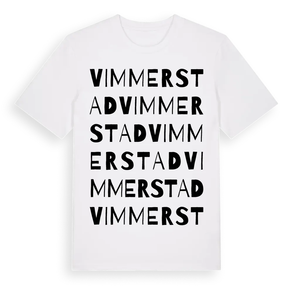 Vimmerstad ordlek t-shirt är inspirerad av Vimmerstad i Västra Götalands län, Sverige. Tröjan är designad för dig som har en speciell koppling till platsen – oavsett om du bor här, har rötterna här eller bara älskar Vimmerstad.