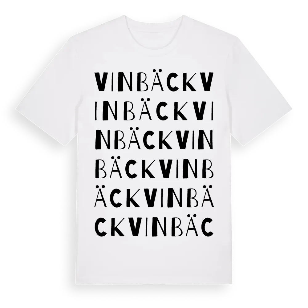 Vinbäck ordlek t-shirt är inspirerad av Vinbäck i Västra Götalands län, Sverige. Tröjan är designad för dig som har en speciell koppling till platsen – oavsett om du bor här, har rötterna här eller bara älskar Vinbäck.