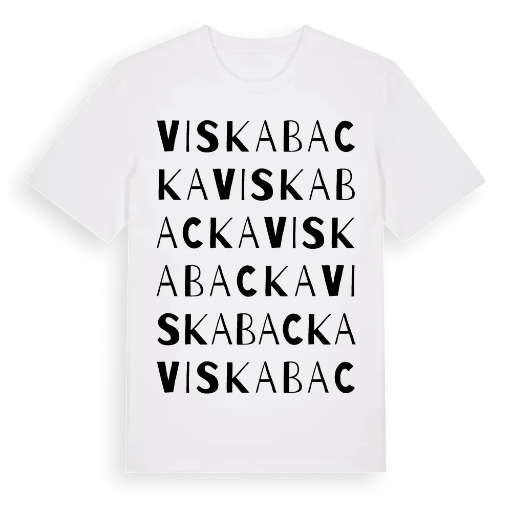 Viskabacka ordlek t-shirt är inspirerad av byn Viskabacka i Västra Götalands län, Sverige. Tröjan är designad för dig som har en speciell koppling till platsen – oavsett om du bor här, har rötterna här eller bara älskar Viskabacka.
