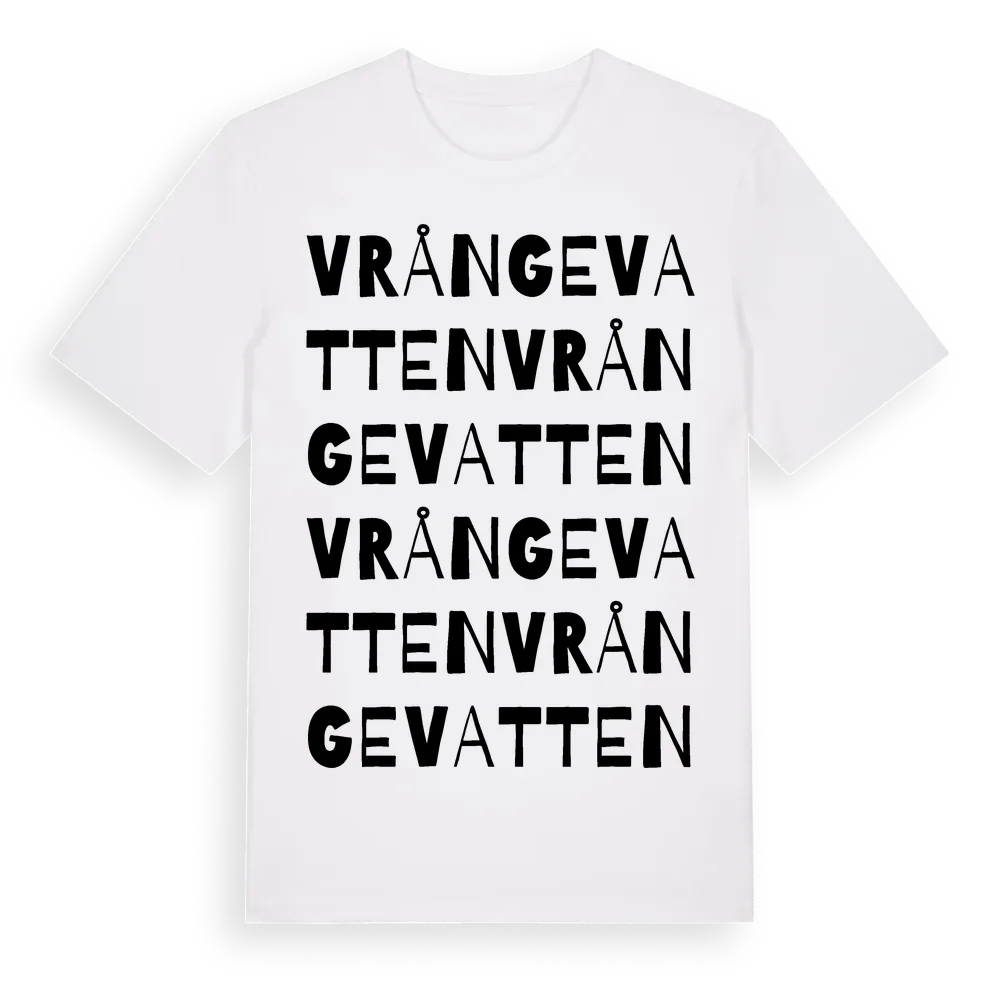 Vrångevatten ordlek t-shirt är inspirerad av Vrångevatten i Västra Götalands län, Sverige. Tröjan är designad för dig som har en speciell koppling till platsen – oavsett om du bor här, har rötterna här eller bara älskar Vrångevatten.