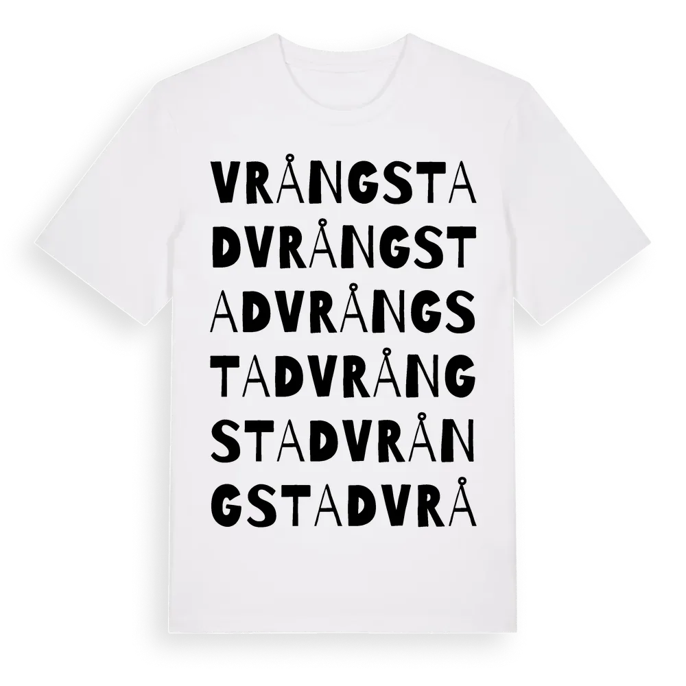 Vrångstad ordlek t-shirt är inspirerad av byn Vrångstad i Västra Götalands län, Sverige. Tröjan är designad för dig som har en speciell koppling till platsen – oavsett om du bor här, har rötterna här eller bara älskar Vrångstad.