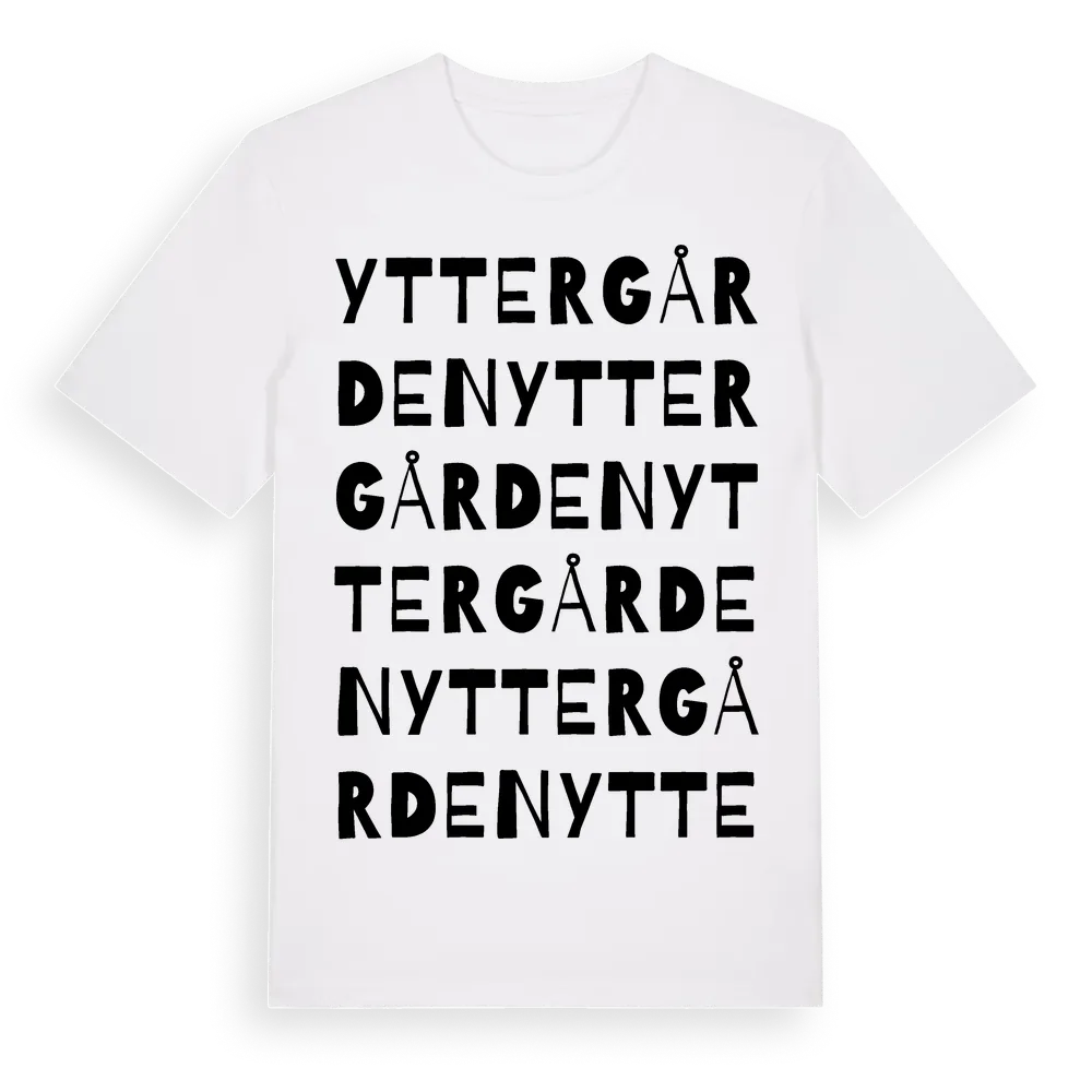 Yttergården ordlek t-shirt är inspirerad av Yttergården i Västra Götalands län, Sverige. Tröjan är designad för dig som har en speciell koppling till platsen – oavsett om du bor här, har rötterna här eller bara älskar Yttergården.